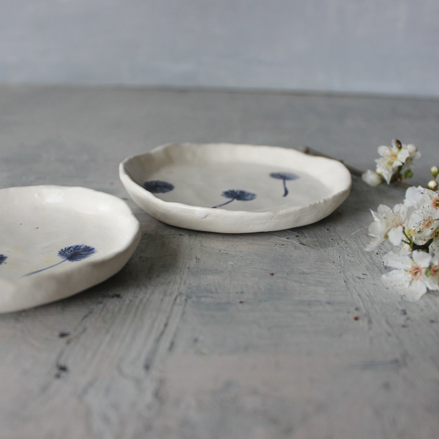 Sweet little round ceramic trays capturing Katherine Wheeler's floating dandelion seed design.