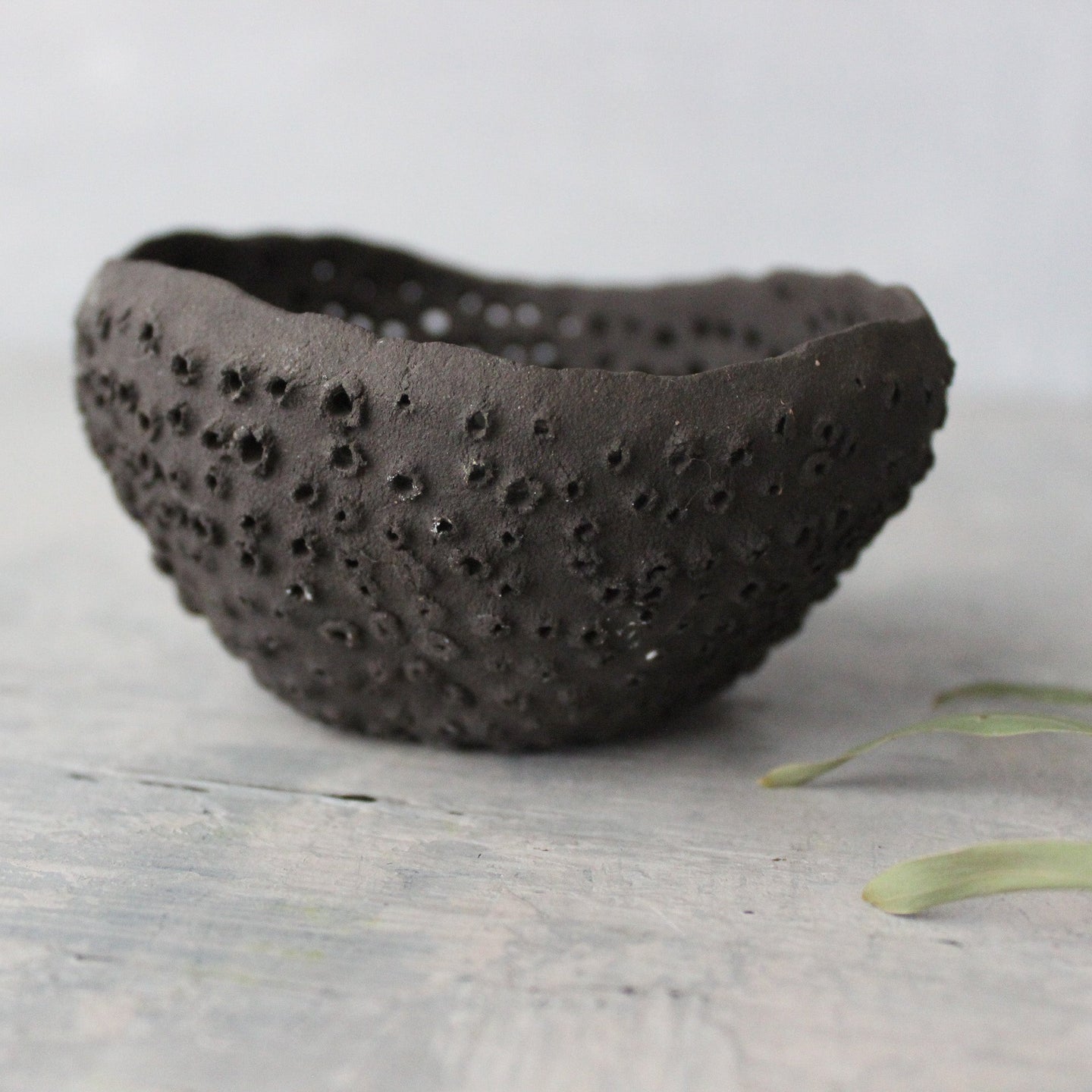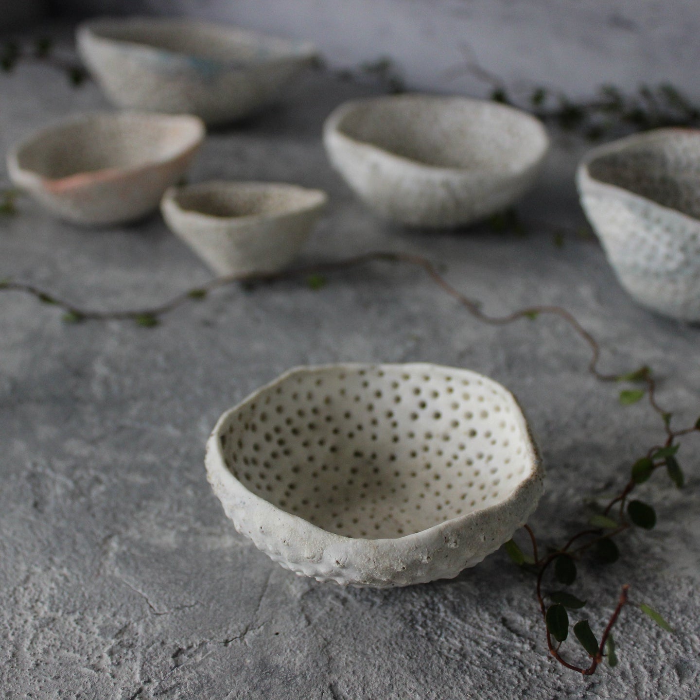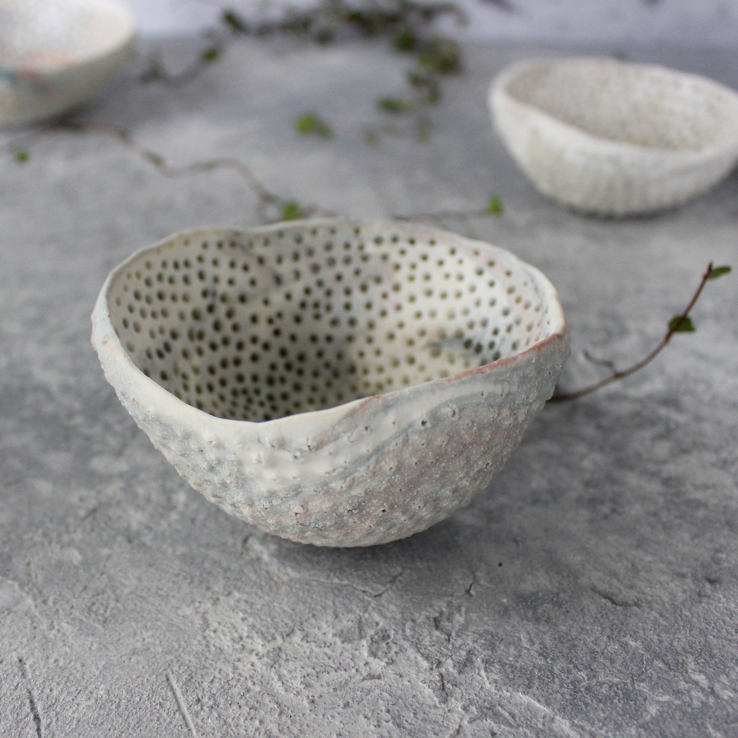 Unique, textural ceramic dishes, organically hand-formed with raw, unglazed finish and repeat pierced detail, reminiscent of ocean life.
