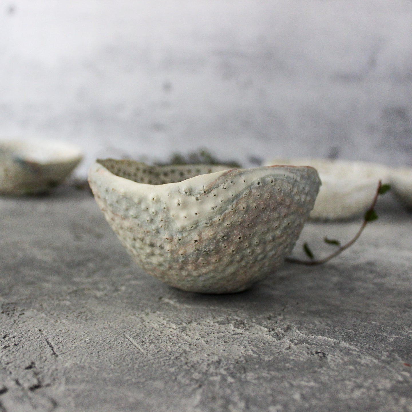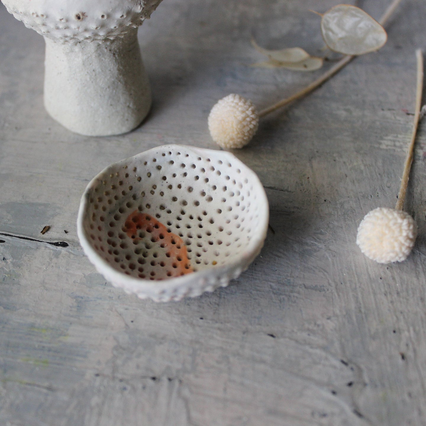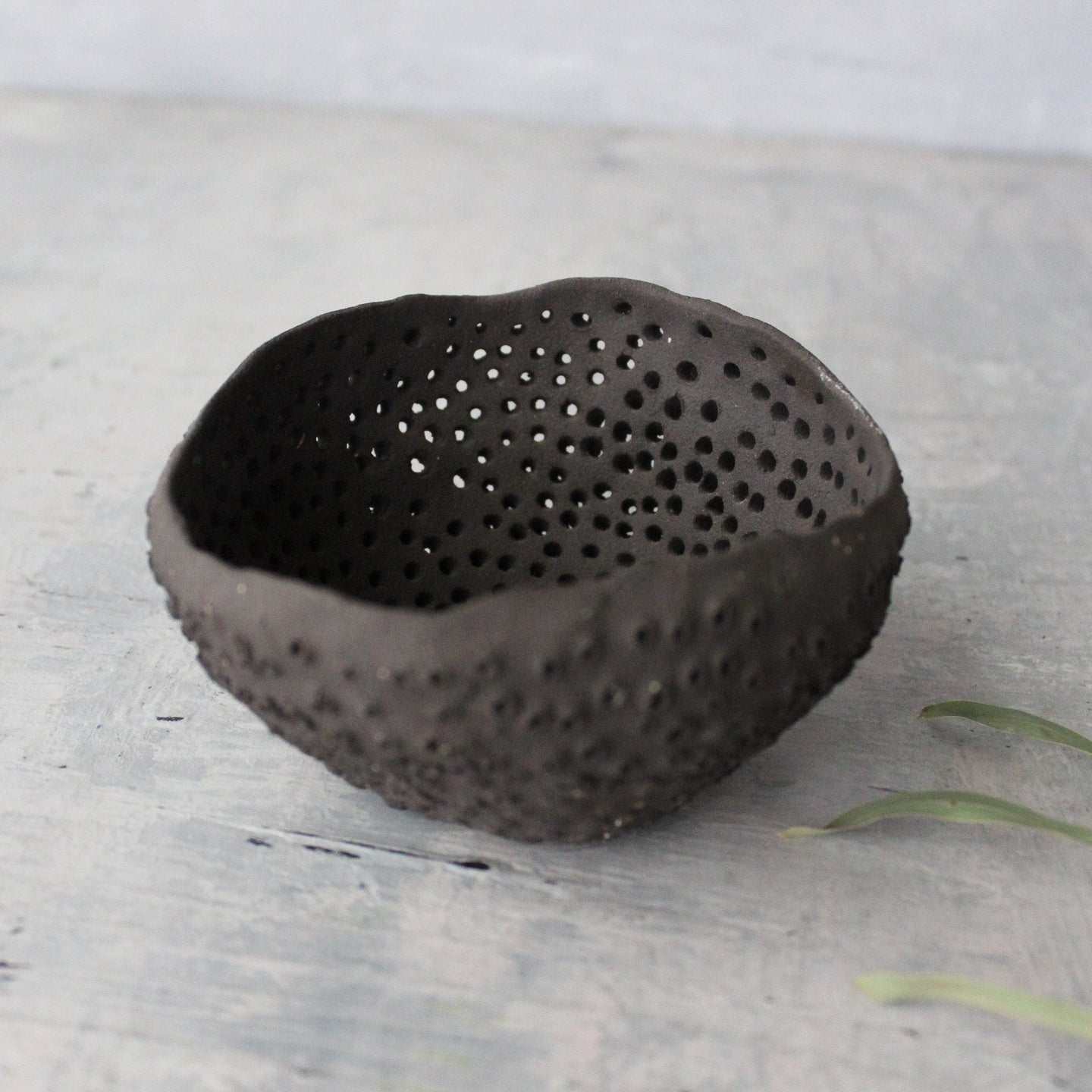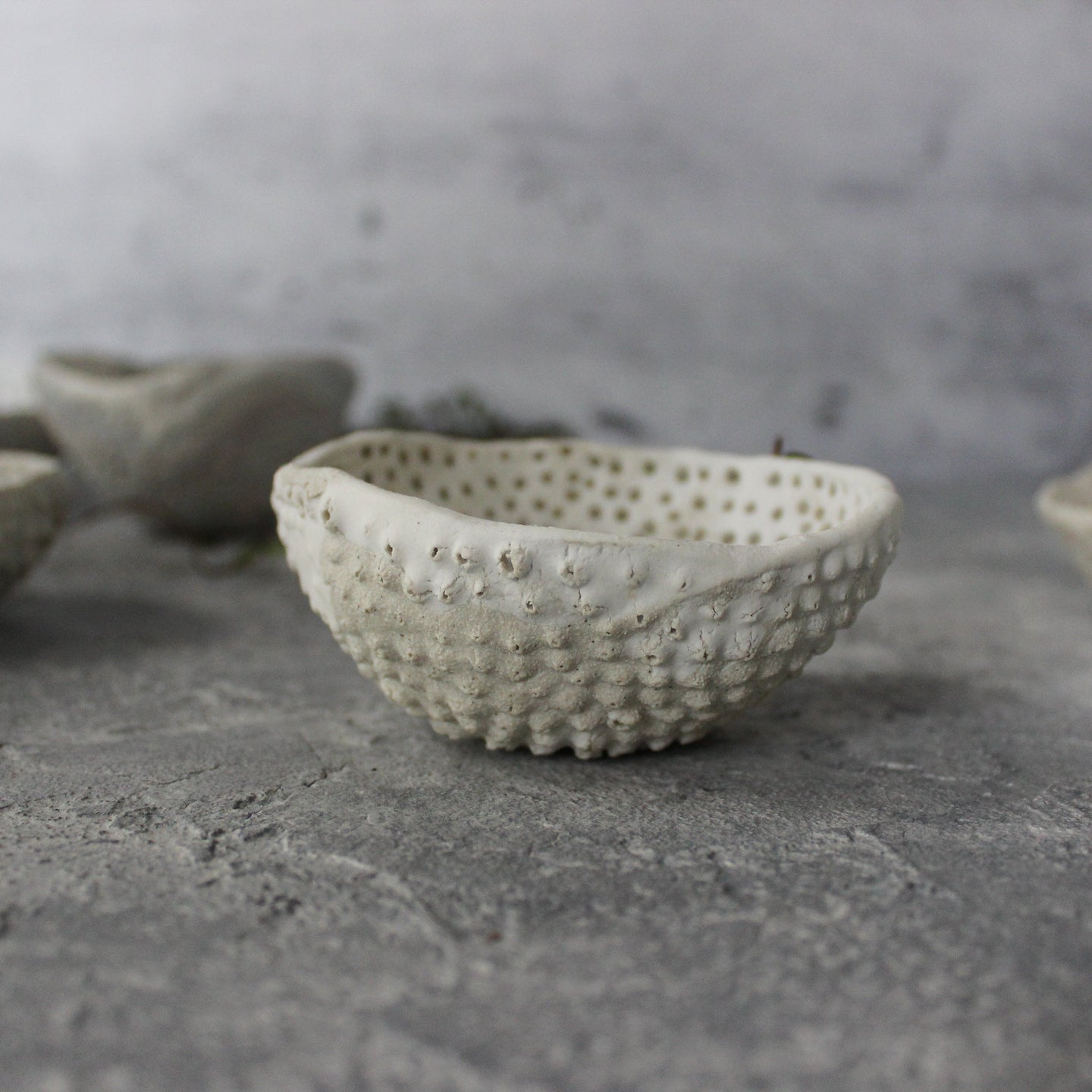Unique, textural ceramic dishes, organically hand-formed with raw, unglazed finish and repeat pierced detail, reminiscent of ocean life.