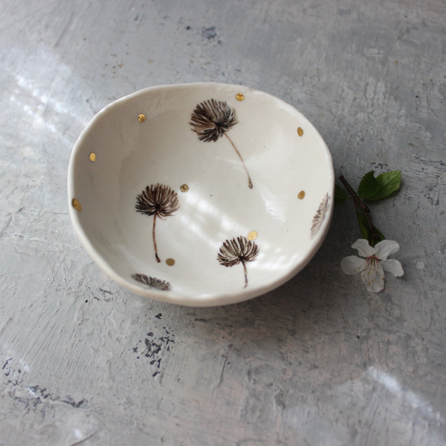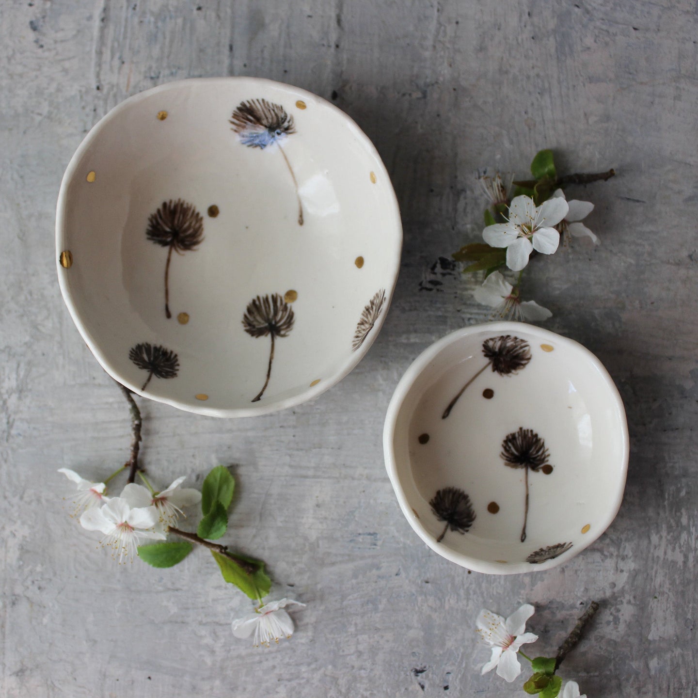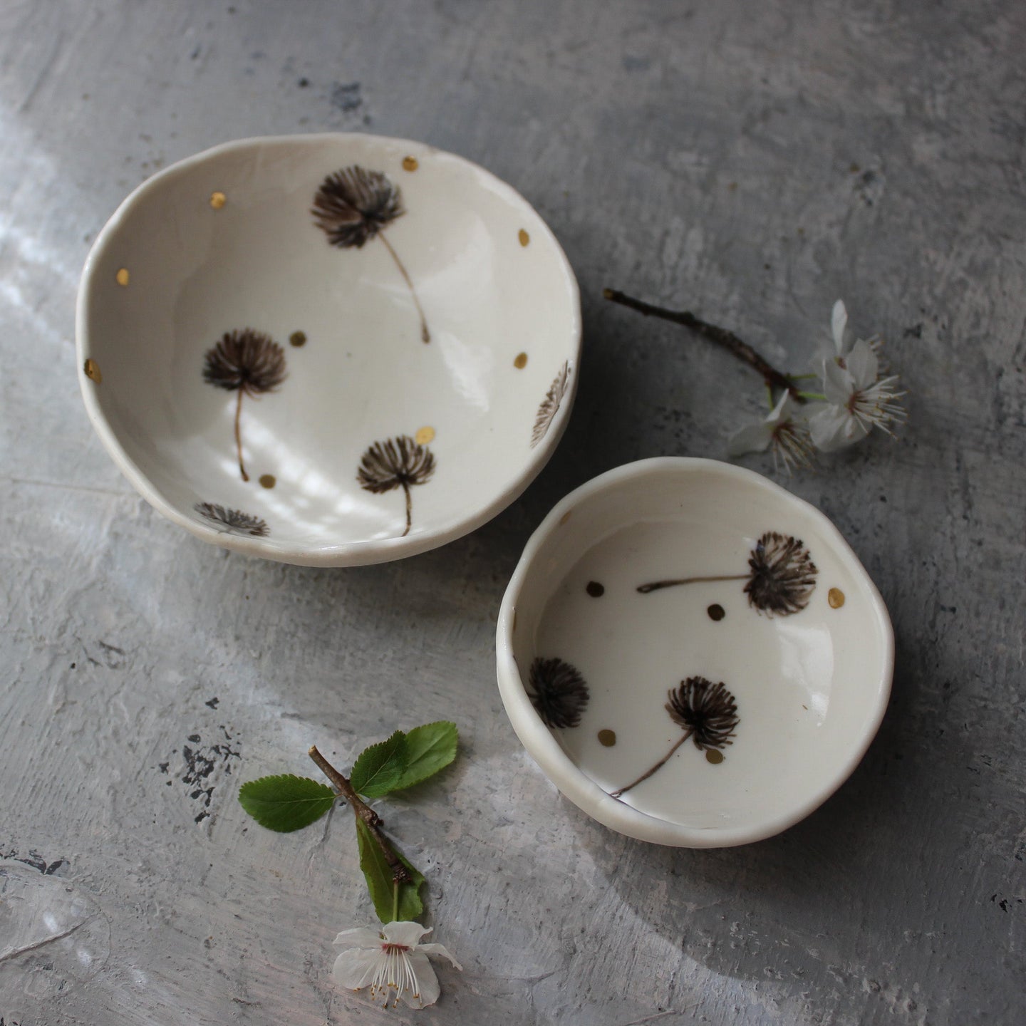The simplicity of floating dandelion seeds hand-painted in sepia tones in these sweet little dishes.