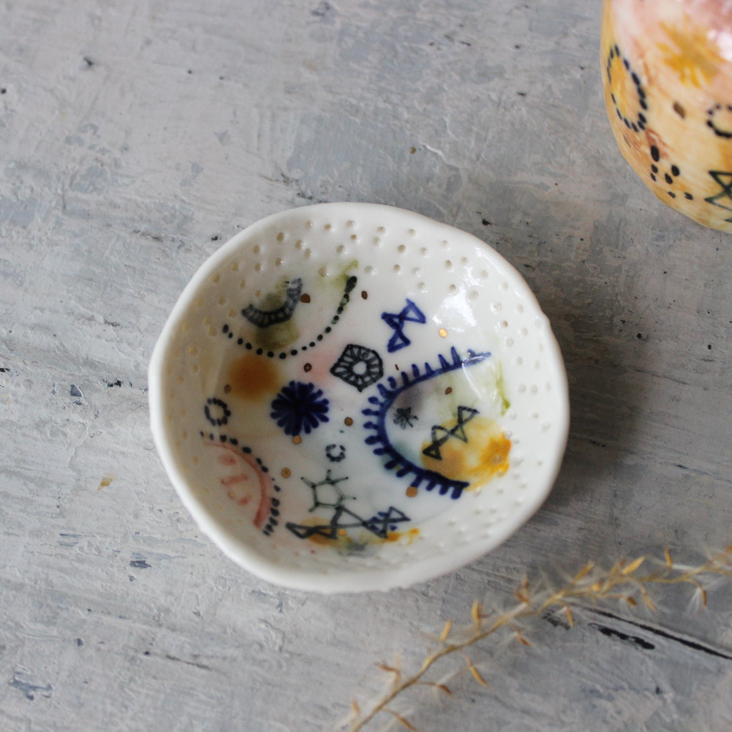Organically hand-formed in fine white porcelain capturing Katherine Wheeler's popular 'stars & cells' design, with washes of colour and touches of 24ct gold lustre.