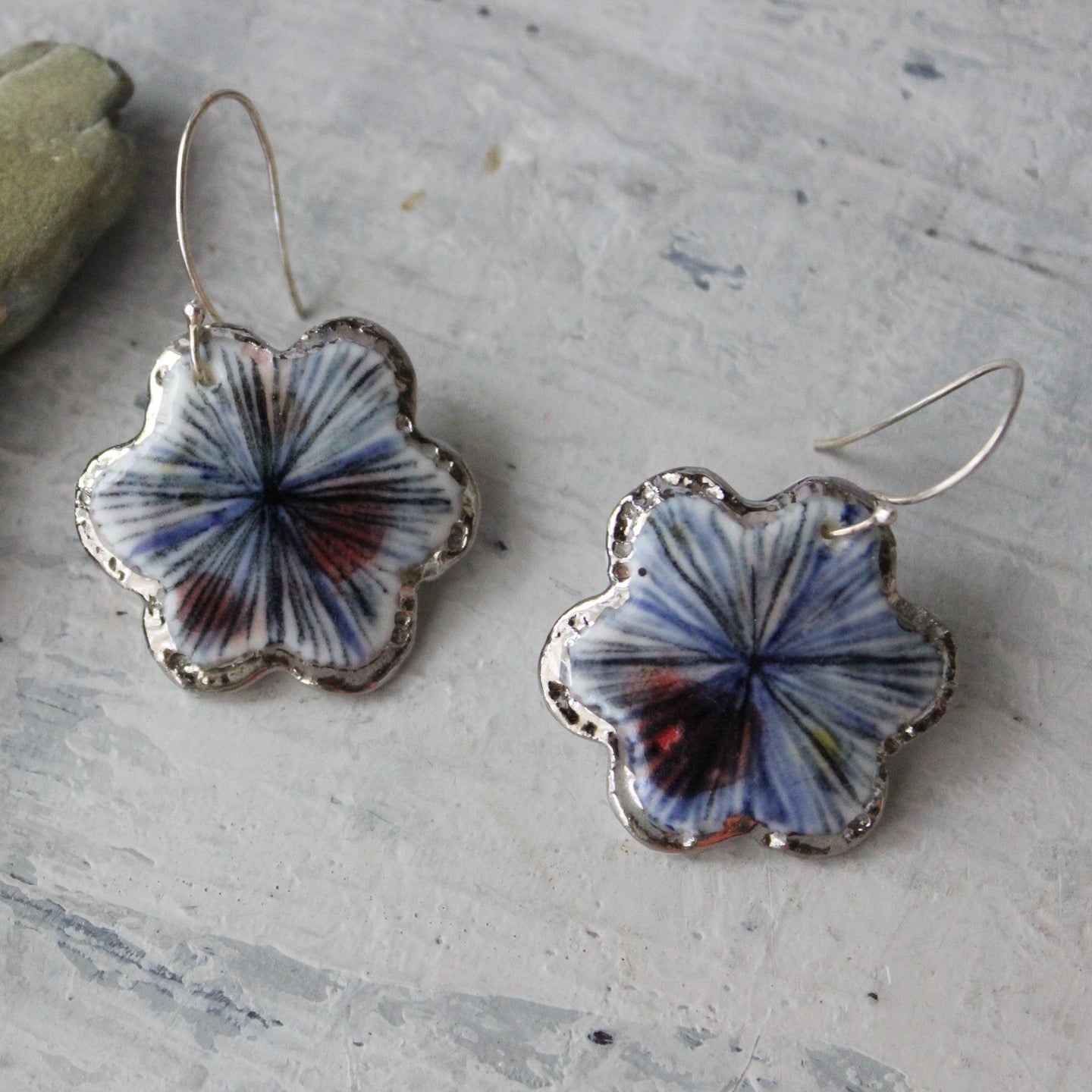 Cute flower-shaped ceramic earrings capturing Katherine Wheeler's hand-painted star design.
