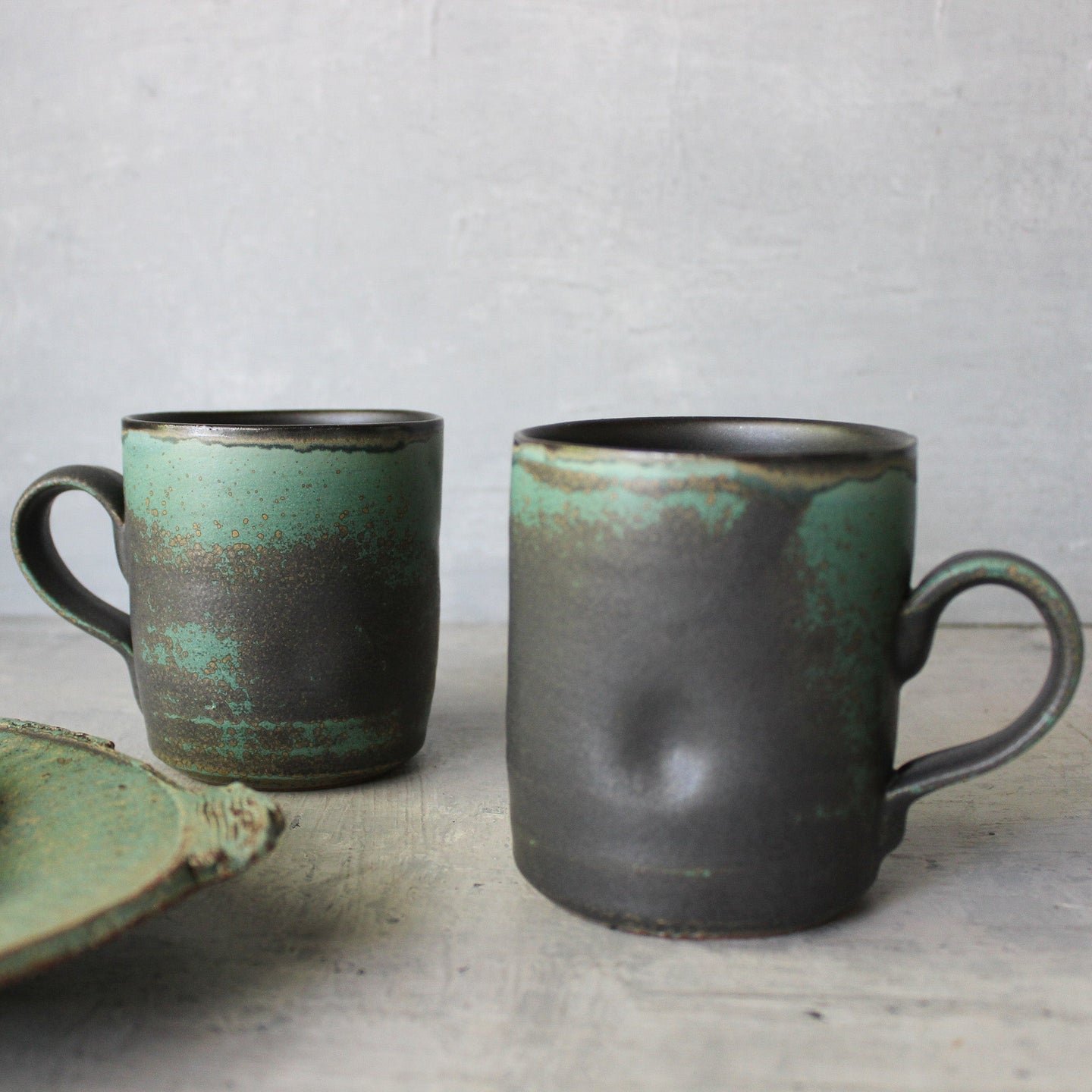 Melbourne based potter Pauline Meade has perfected the large handled mug, wheel thrown in stoneware clay with gorgeous mottled green on black glaze, cups to enhance your everyday tea or coffee ritual.