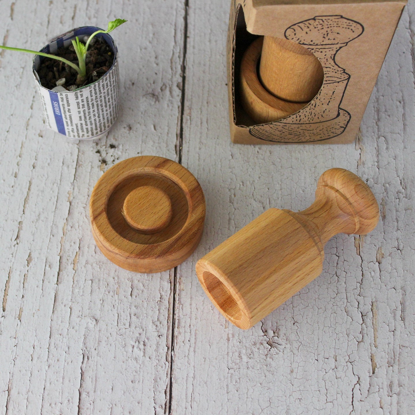 Made from oiled beech, pot press measures 14 x 8 x 8cm.
