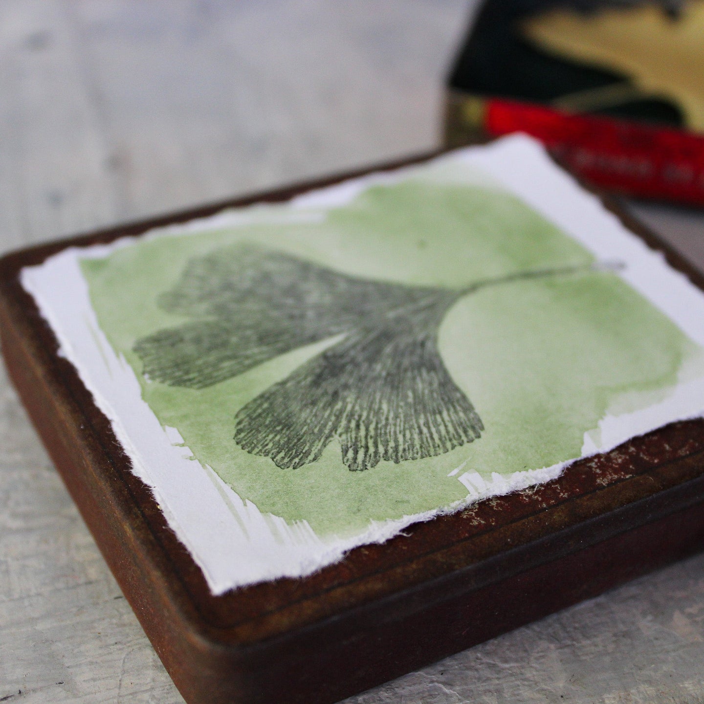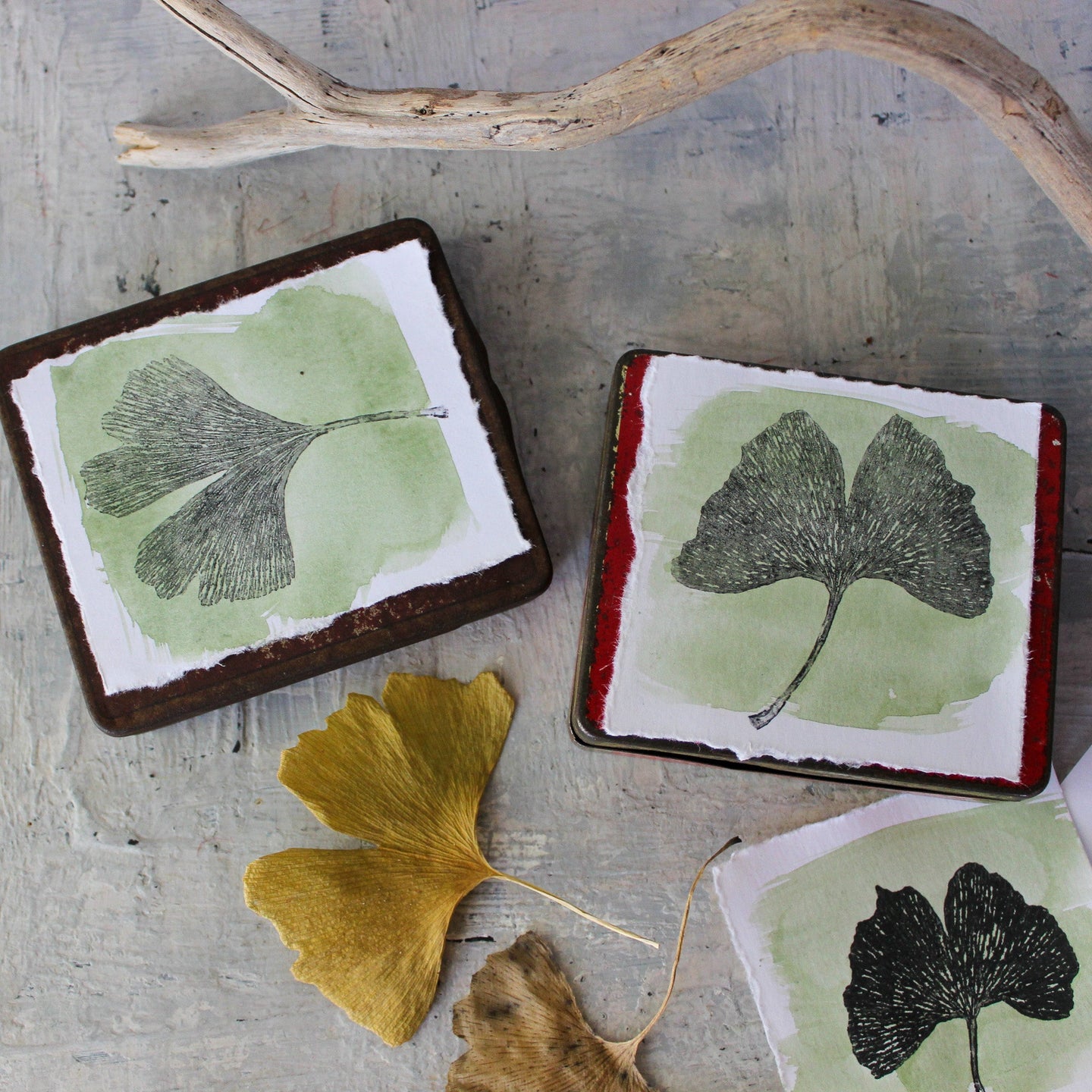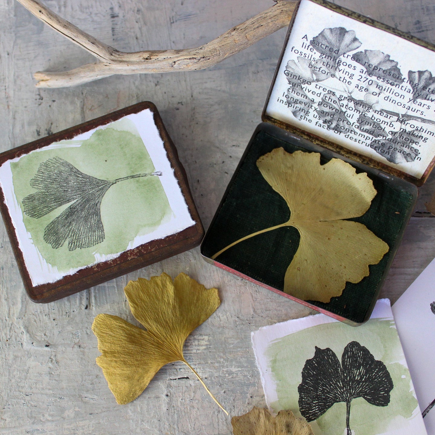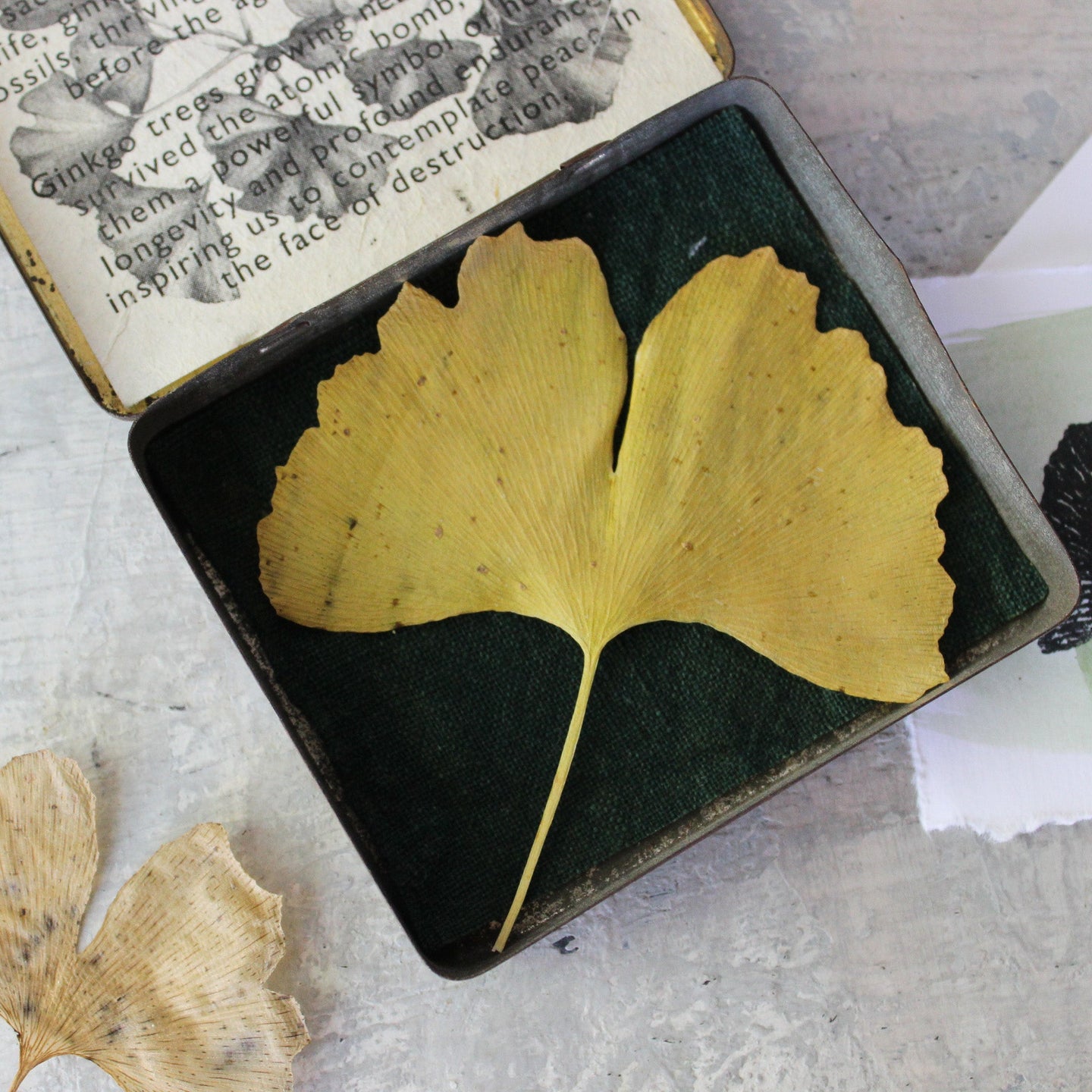 Assembled with care, each vintage cigar tin holds a large pressed gingko leaf from my garden, resting on a piece of vintage kimono fabric. The tin lid features an original ginkgo leaf eco-print, with plant significance included inside.