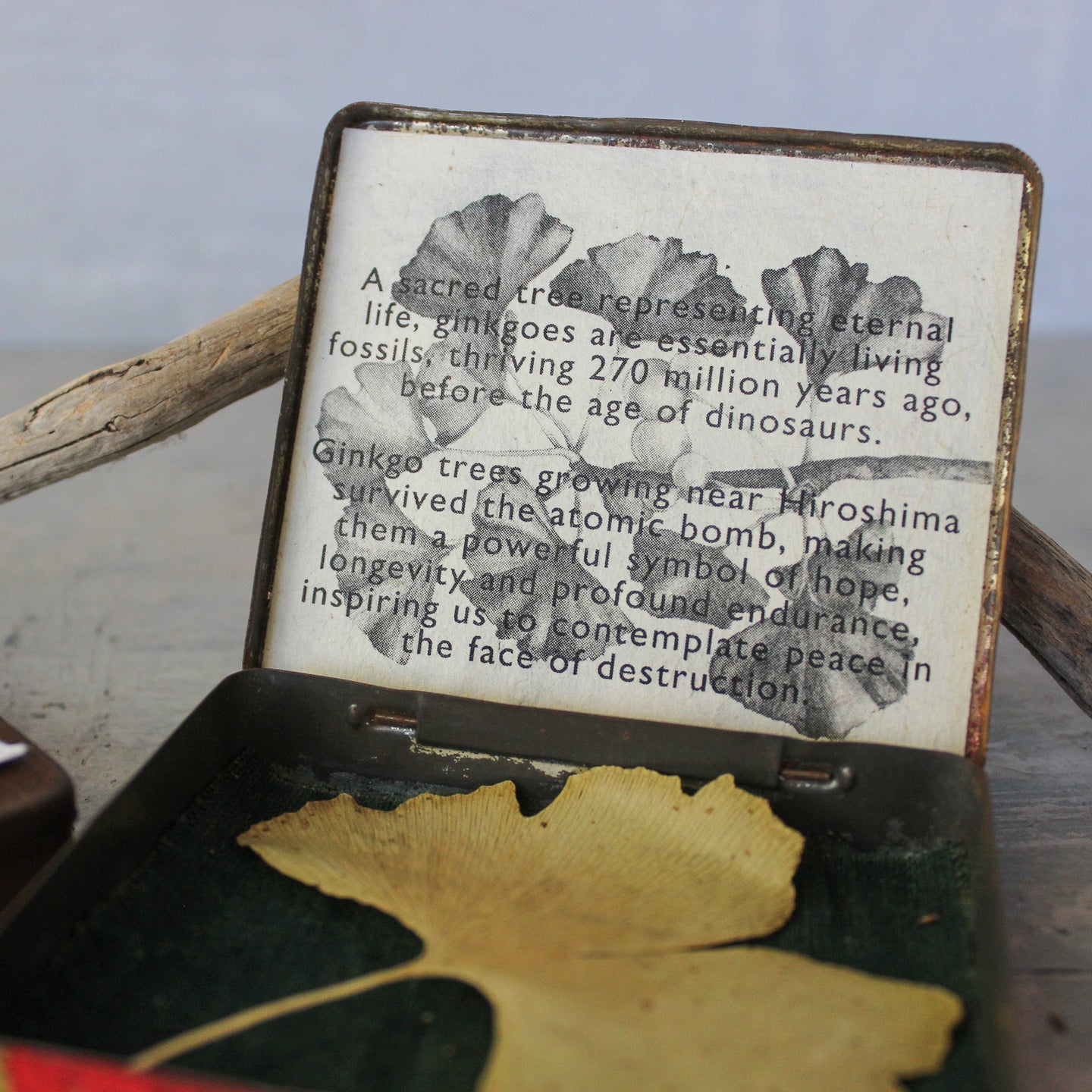 Vintage ginkgo specimen tin, a unique gift offering connection to the wonders of Mother Earth.