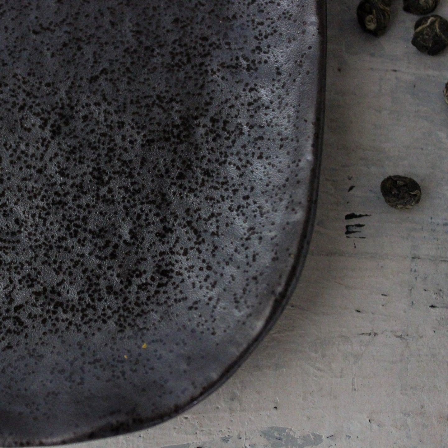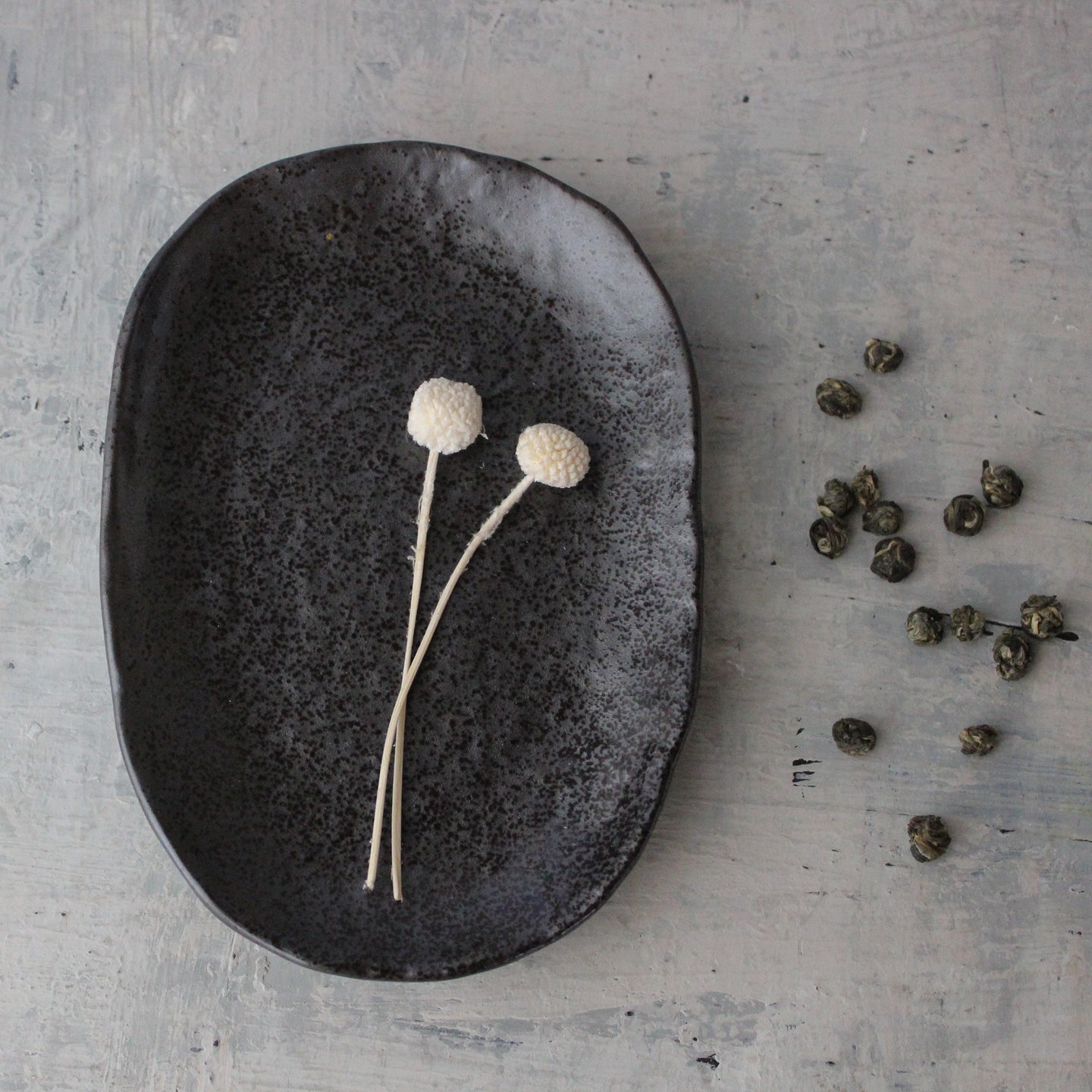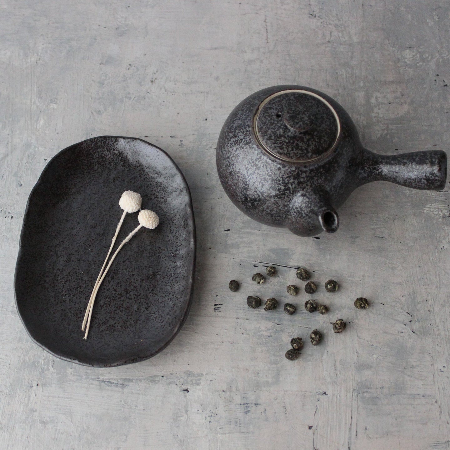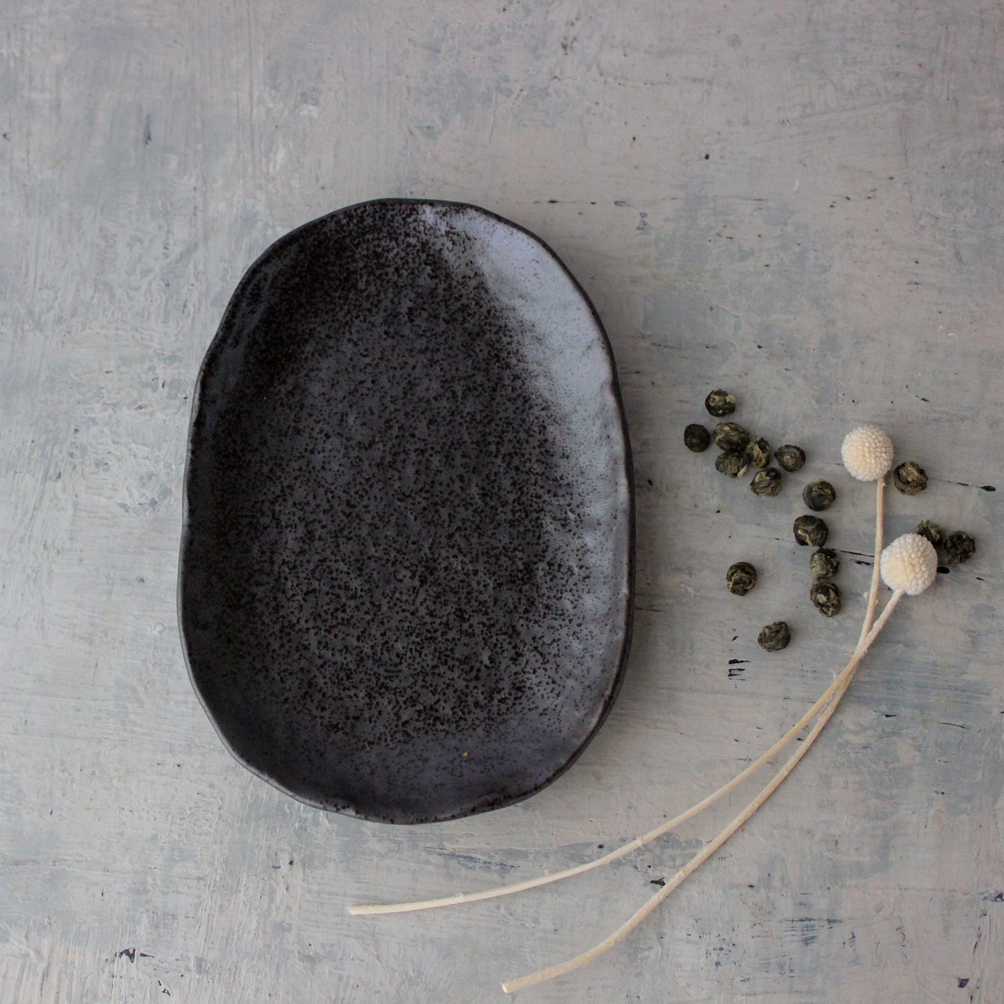 Enhance your dining experience with beautifully crafted Japanese Mino ware oval side plate with textural black finish.