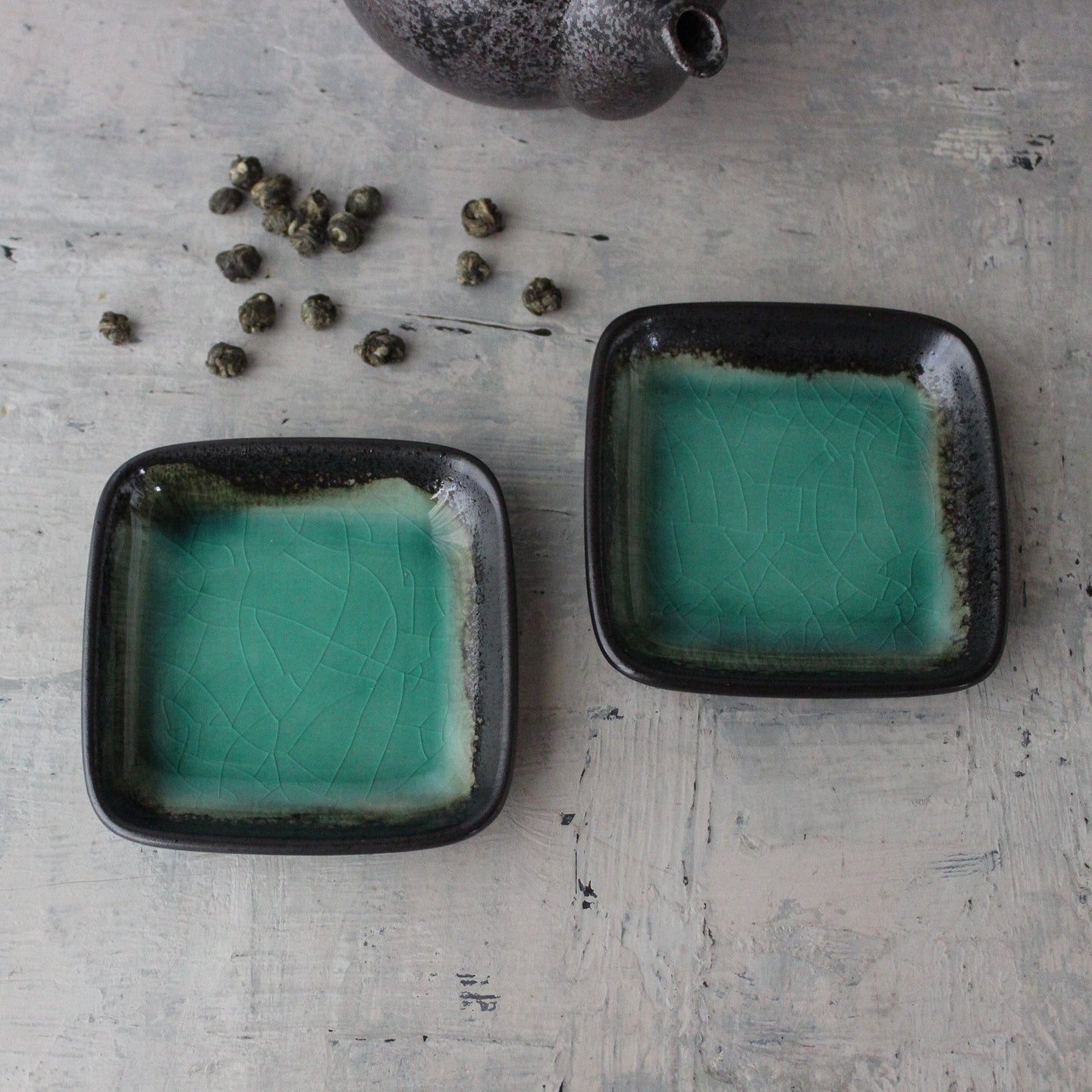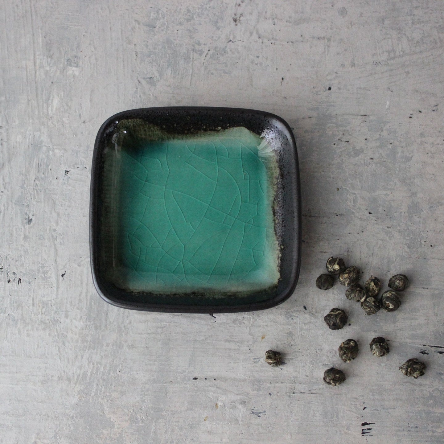 Enhance your dining experience with beautifully crafted Japanese Mino ware small square dish with sea green glaze.