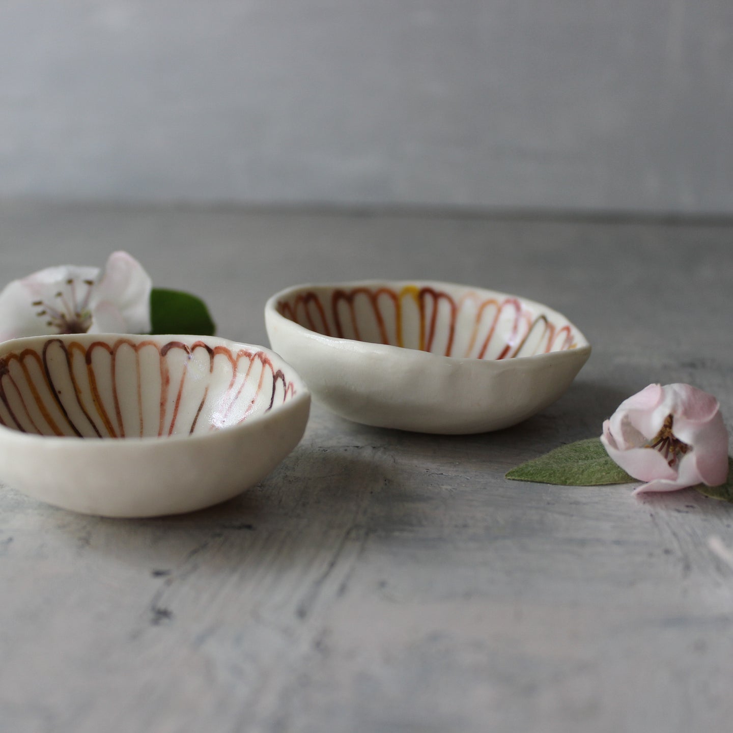 Tiny little trinket dishes, with hand-painted daisy detail in sepia red hues.