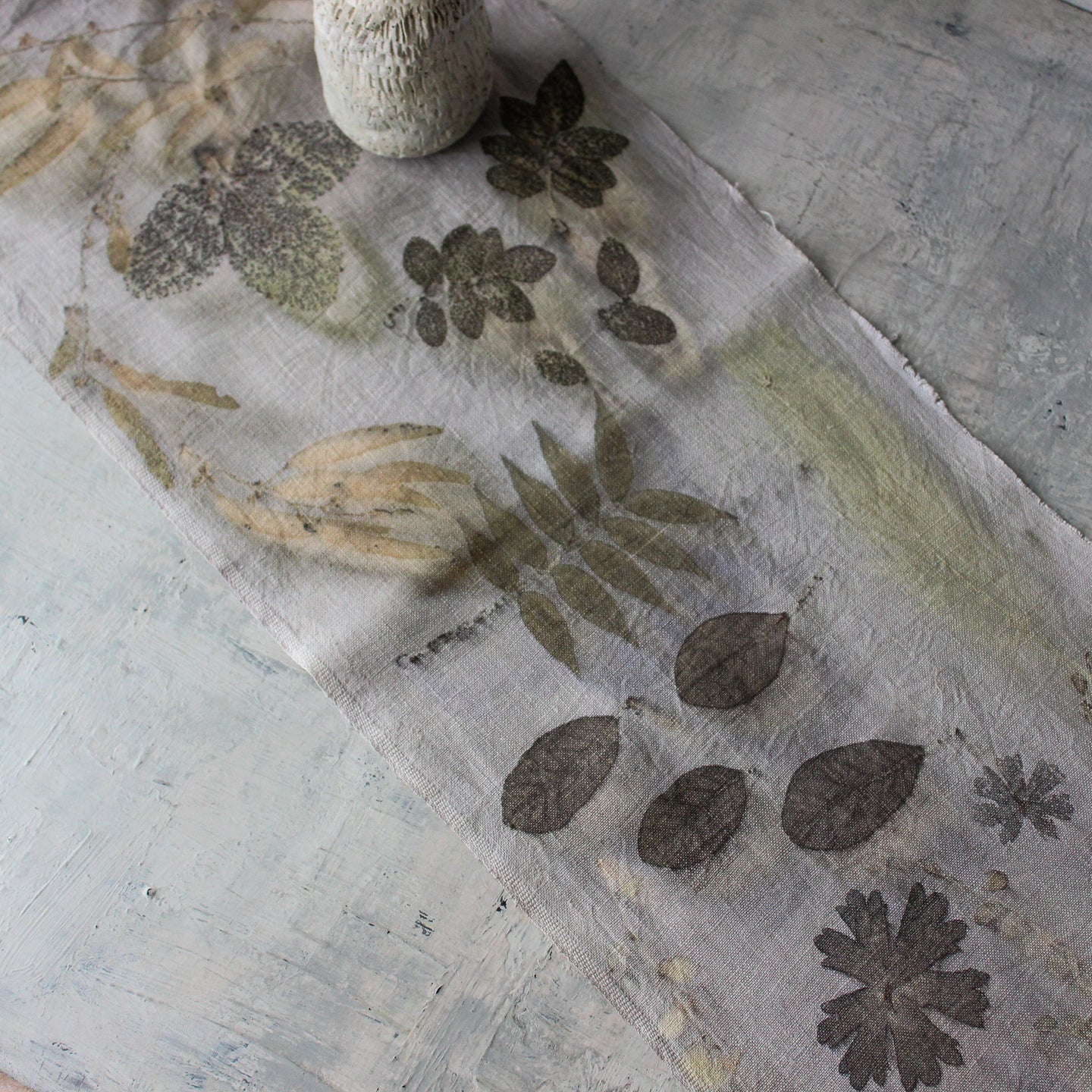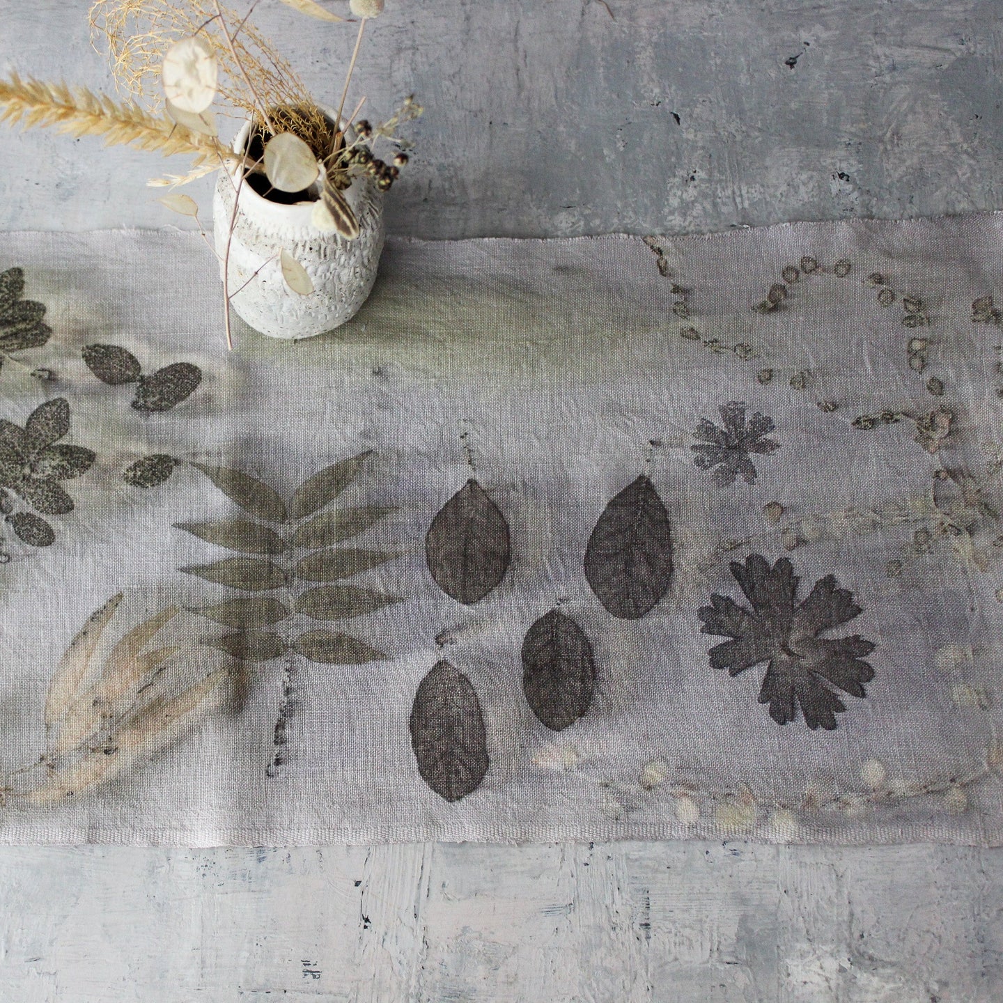 Locally made, botanical eco-print linen runner/placemat, a unique home decor accent or perhaps inspiration for your next bespoke textile project.