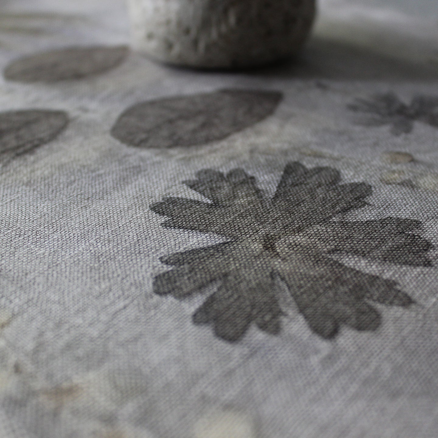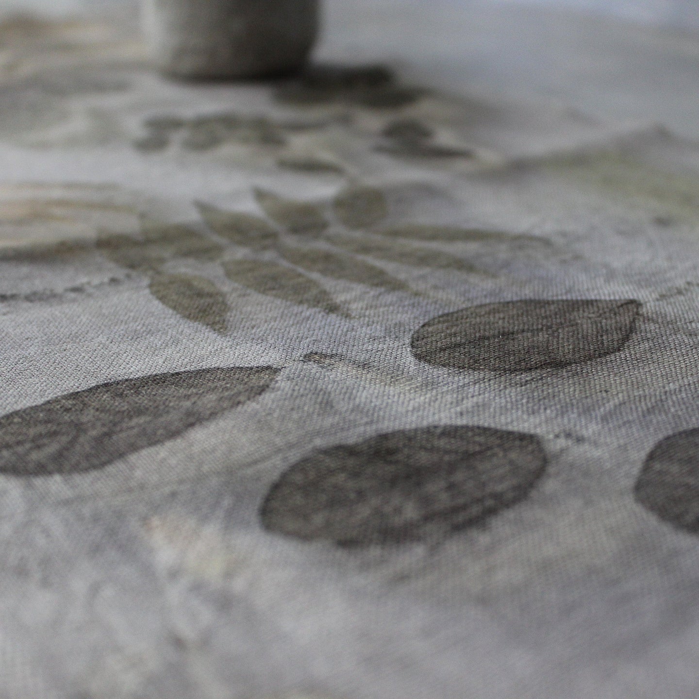 Textural mid weight linen, botanically eco-printed with locally foraged foliage to reveal moody greys, silhouettes and impressions. A long, slow meditative process of preparing the fabric, gathering nature specimens and creating the multi-layer eco-print, featuring pistachio, geranium, maidenhair vine, eucalyptus and rose.