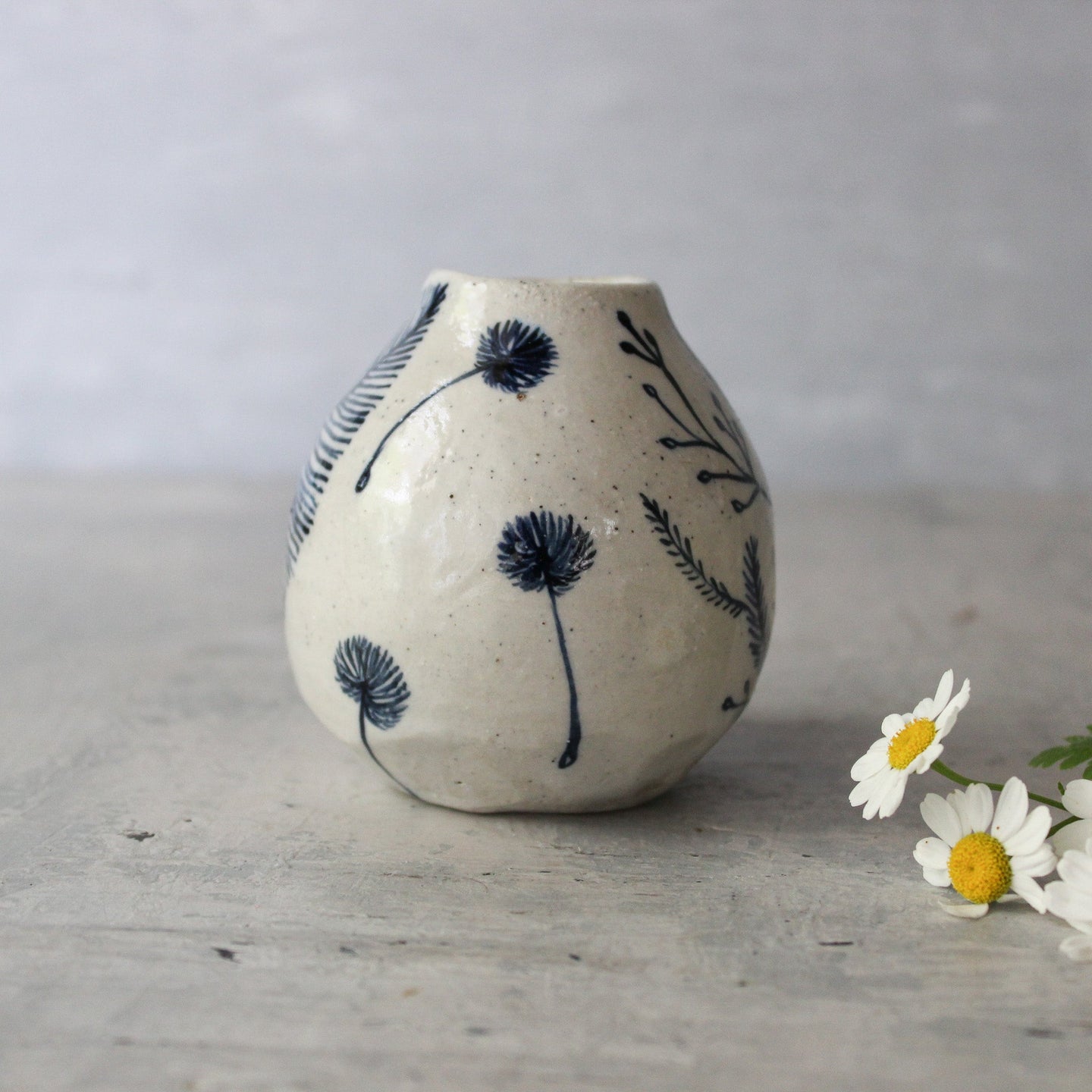 Katherine Wheeler's intricate, hand-painted designs - feather, sea twig and floating dandelion seeds - captured in this sweet little ceramic bud vase.