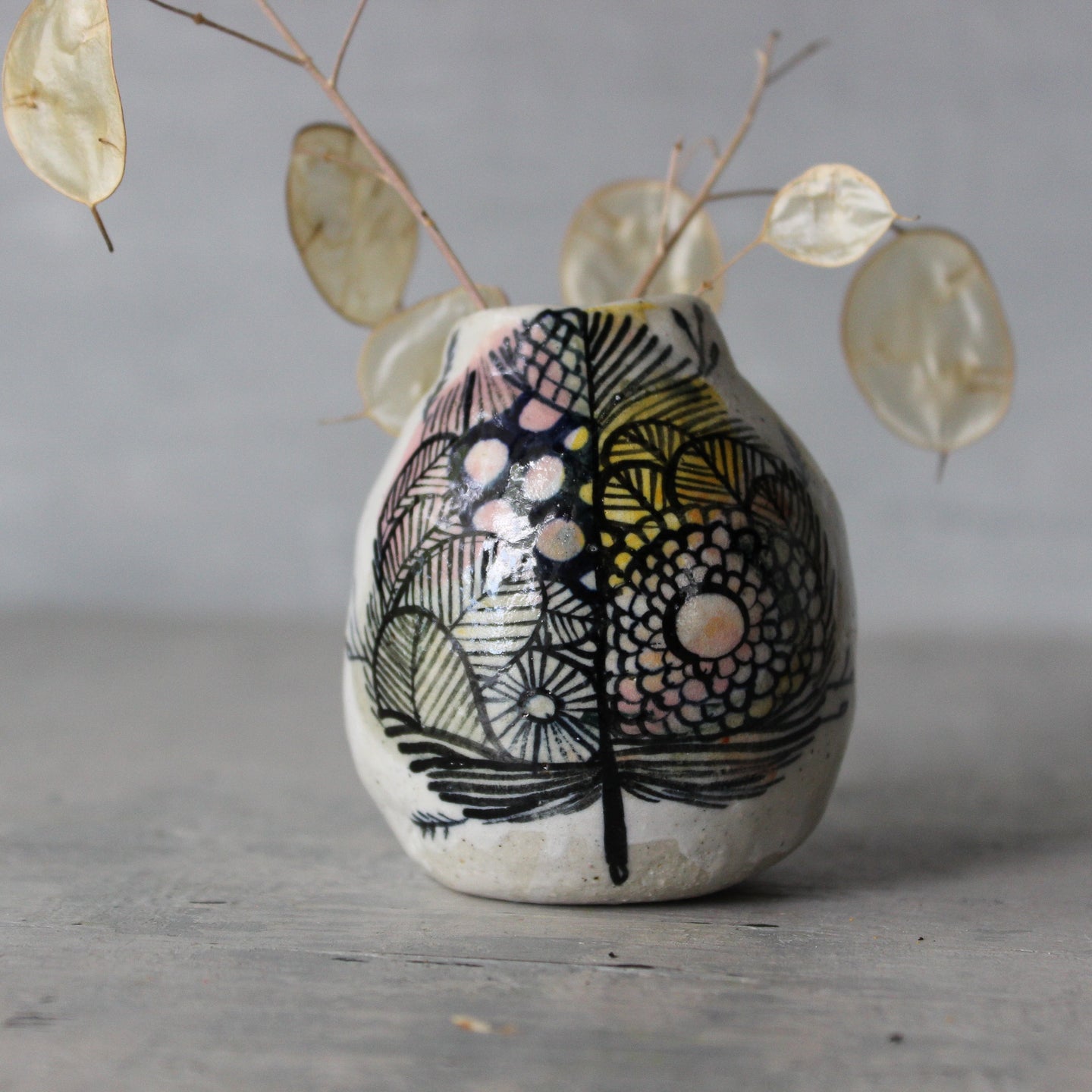 Katherine Wheeler's intricately detailed artwork captured in this unique little ceramic vase.