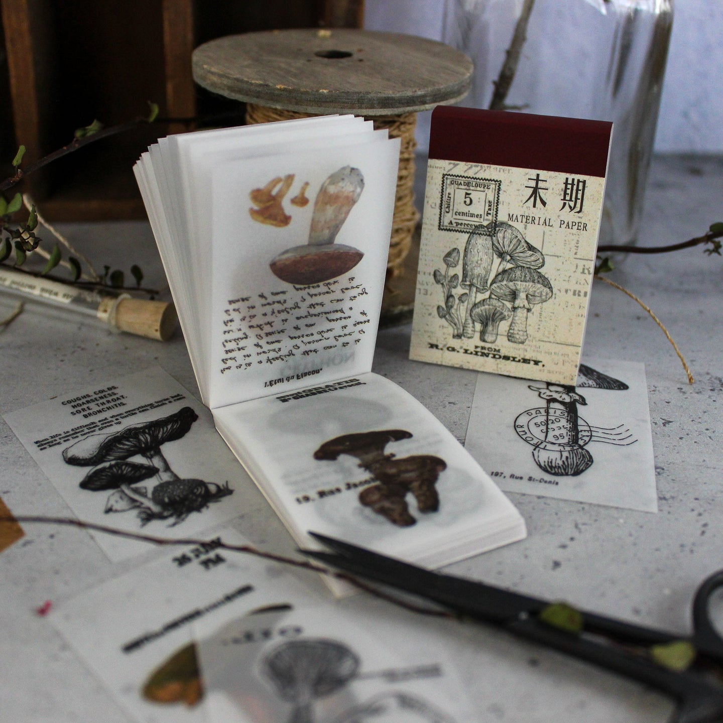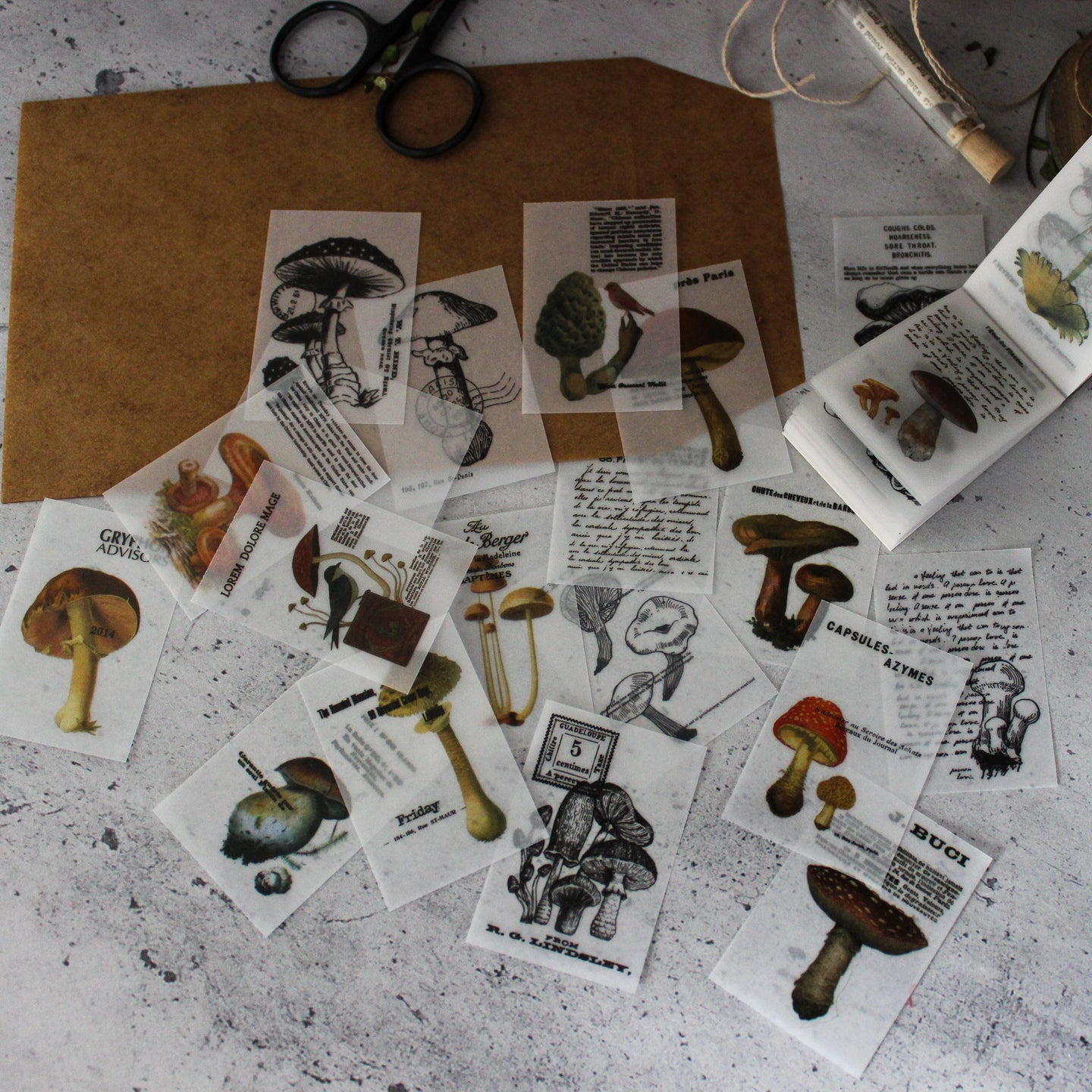 A delightful selection of vintage illustrations of fungi in all it's forms on translucent paper notelets.